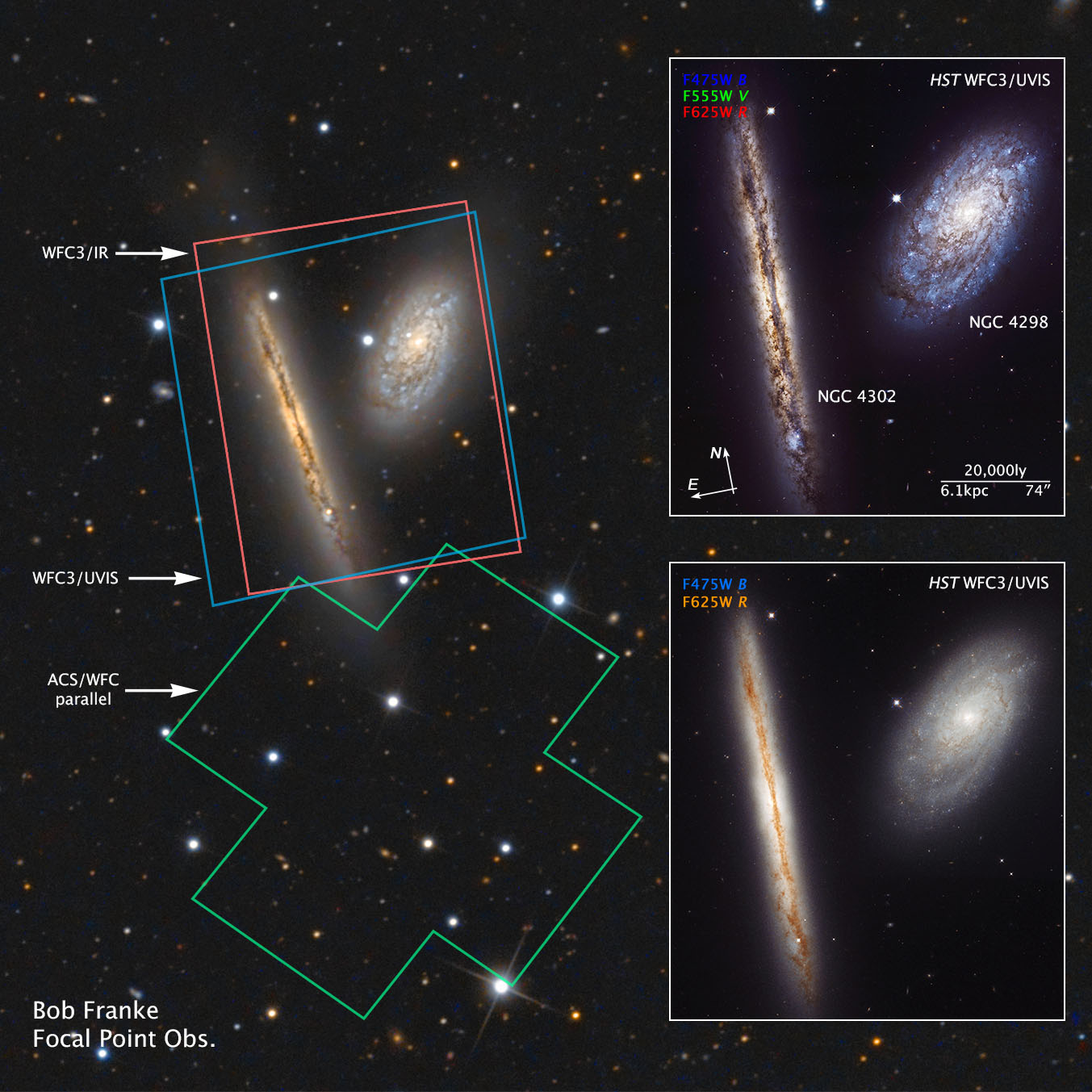 К очередной дате на сайте телескопа опубликовали несколько снимков удивительной пары галактик — NGC 4302 и NGC 4298, находящейся от нас на расстояние в 55 миллионов световых лет в созвездии Coma Berenices в скоплении Девы.